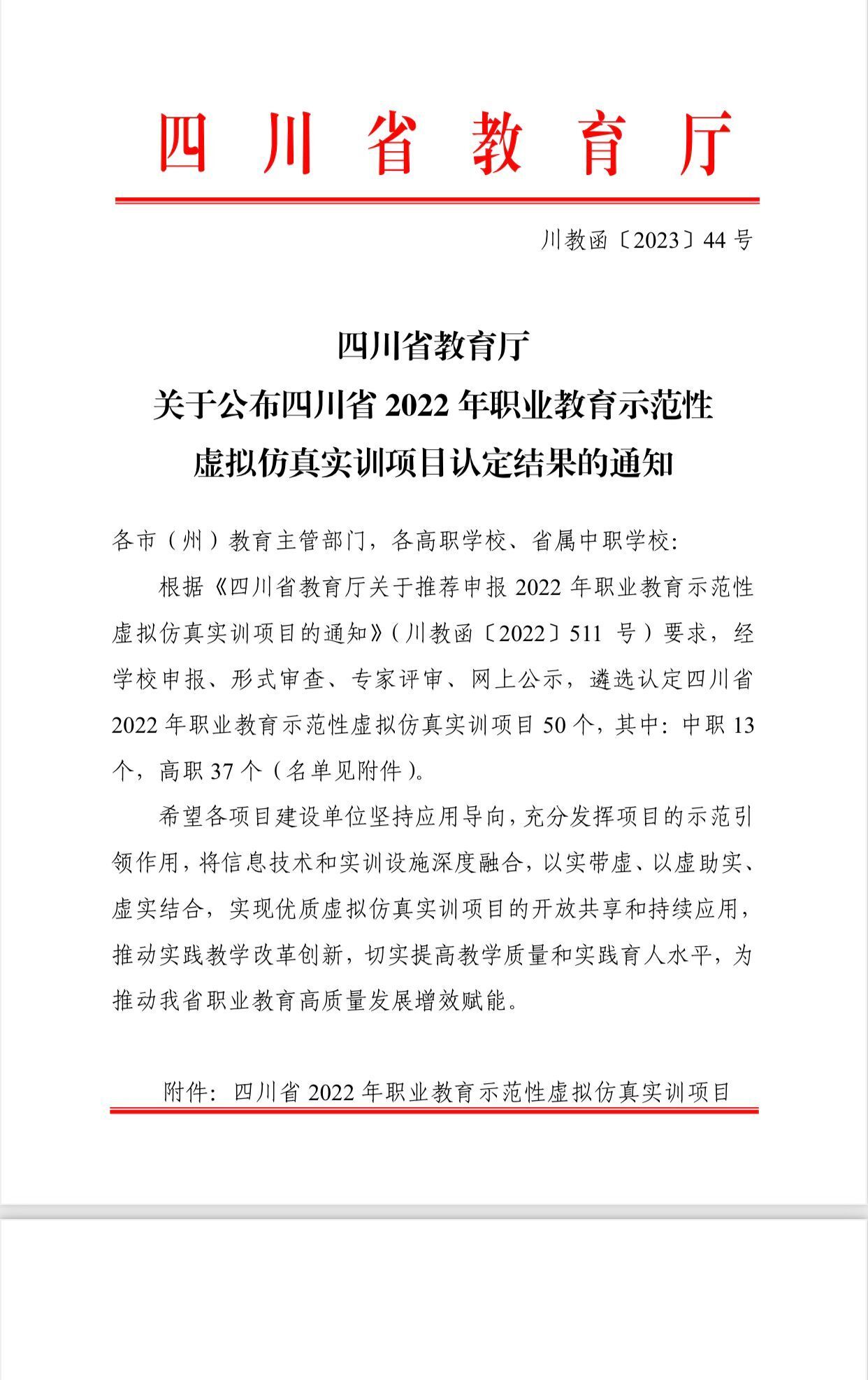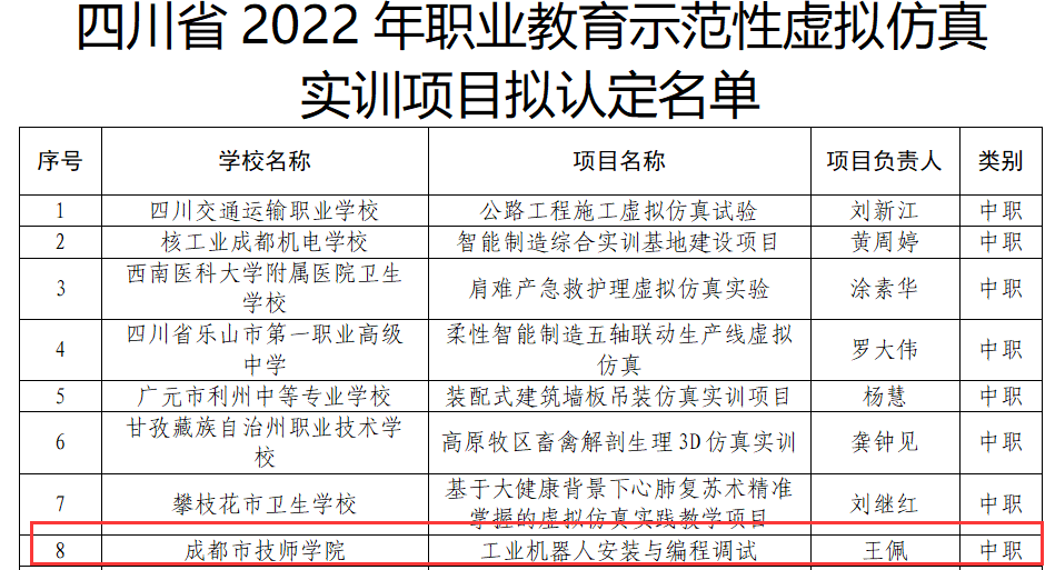 根据四川省教育厅发布的《关于公布四川省 2022 年职业教育示范性虚拟仿真实训项目认定结果的通知》川教函〔2023〕44号,成都市技师学院三亿的“工业机器人安装与编程调试”项目经学校推荐、组织形式审查、专家评审,最终成功入选。此次成功入选四川省2022年职业教育示范性虚拟仿真实训项目,进一步提升了学院虚拟仿真实训项目的影响力。学院将继续深化虚拟仿真实训教学改革与创新,为学校三名工程建设、职业教育的高质量发展提供有力支撑。